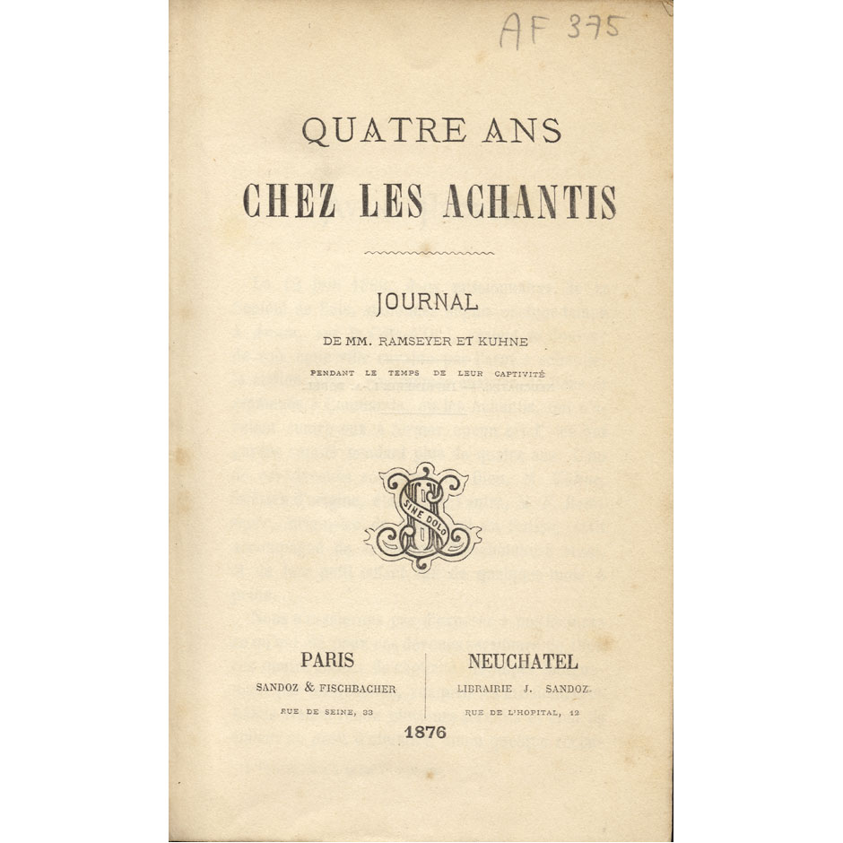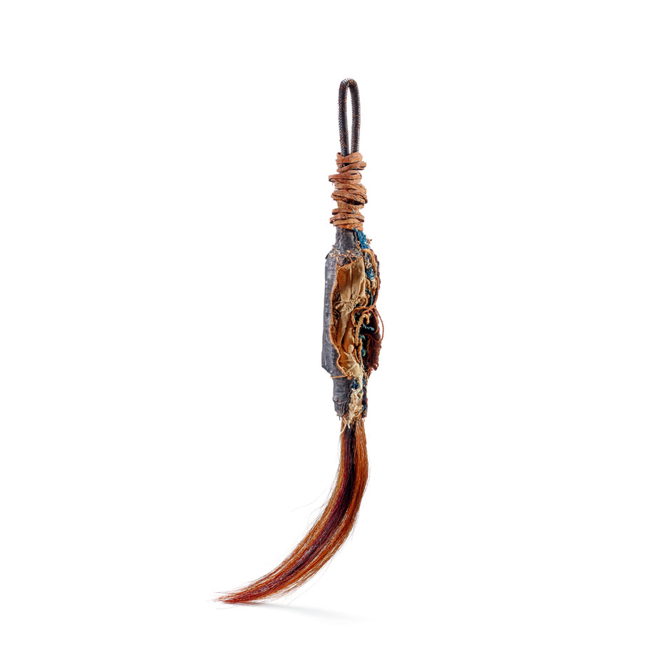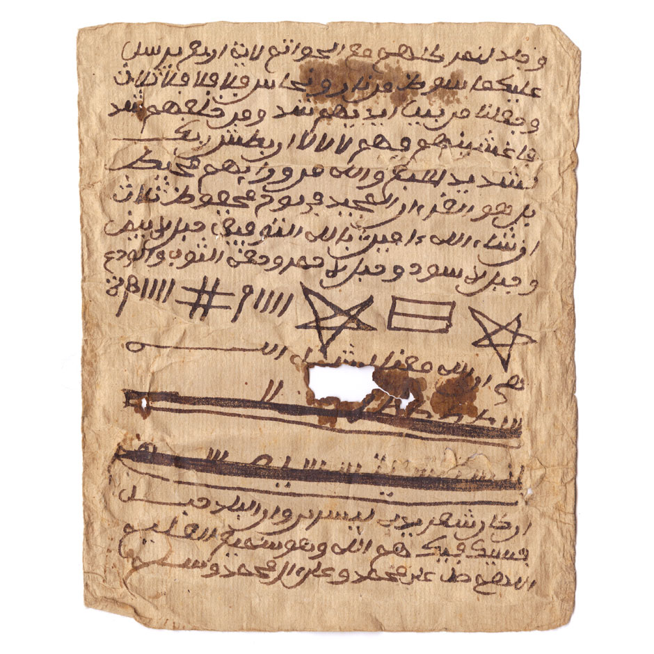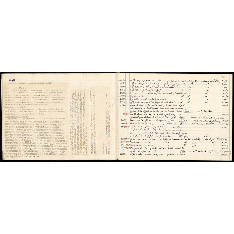 En le disséquant pour mieux le comprendre ? C’est ce que nous raconte ce chasse-mouches, amulette propitiatoire, décousue, éventrée et fragmentée. Elle a été, en effet, vidée de sa charge magique, qui était constituée, d’après le registre d’inventaire du Musée en 1953, d’une lame de couteau, d’une pièce de cuir et de cinq feuillets coraniques. Les deux premiers éléments ont disparu. Les prières et formules magiques manuscrites, dépliées, ont été reléguées dans un tiroir destiné aux oeuvres en deux dimensions. En 2018, le lien est enfin rétabli entre le chassemouches à la blessure béante et ces textes marqués de leurs plis d’origine, retrouvés sans documentation aucune sur leur appartenance initiale à l’amulette qu’ils devaient activer. Le registre d’inventaire original stipule que le souverain asante Kofi Karikari lui-même aurait offert le chasse-mouches au missionnaire Ramseyer alors qu’il le retenait comme prisonnier politique à Kumasi (capitale de l’Empire asante au Ghana) entre 1869 et 1874. Cette information n’est pas corroborée par le Journal corédigé par les pasteurs otages.
