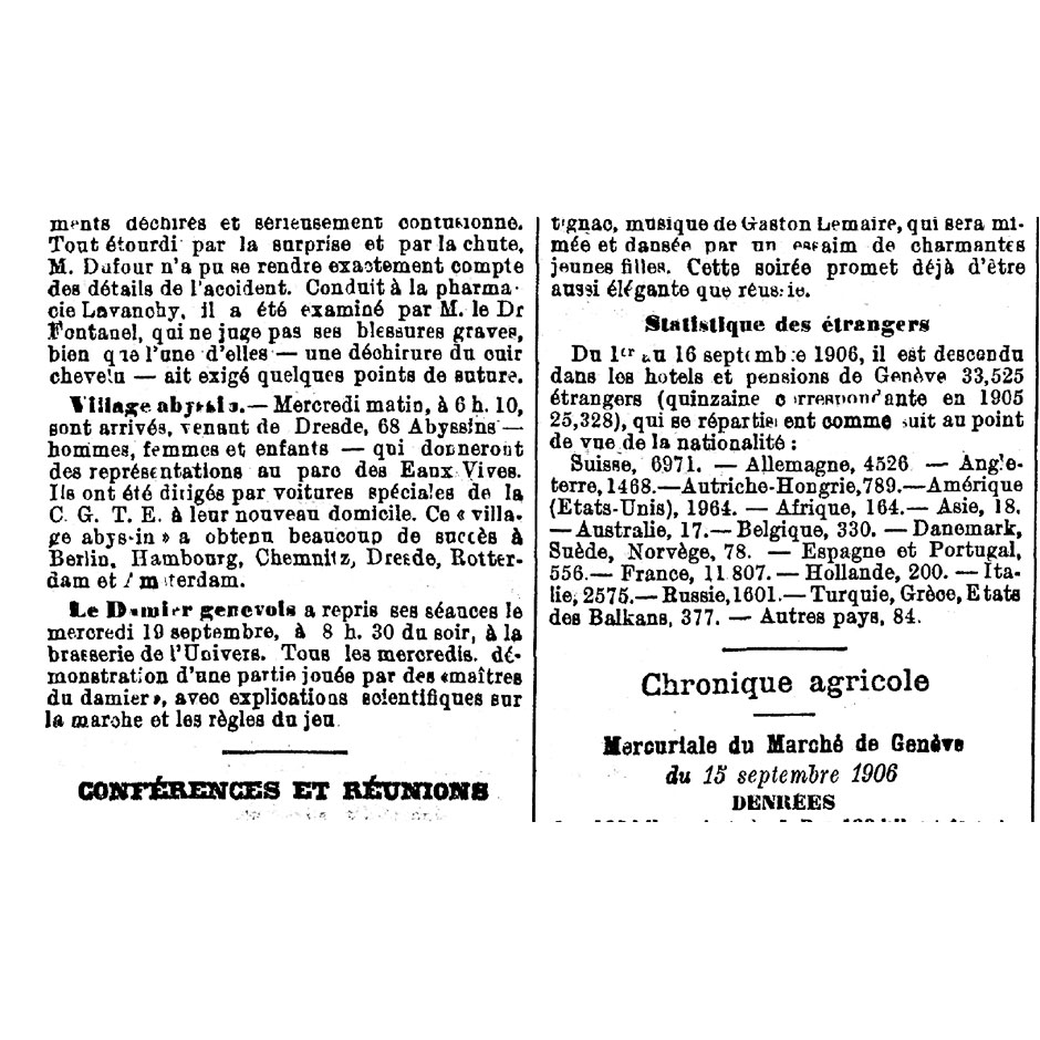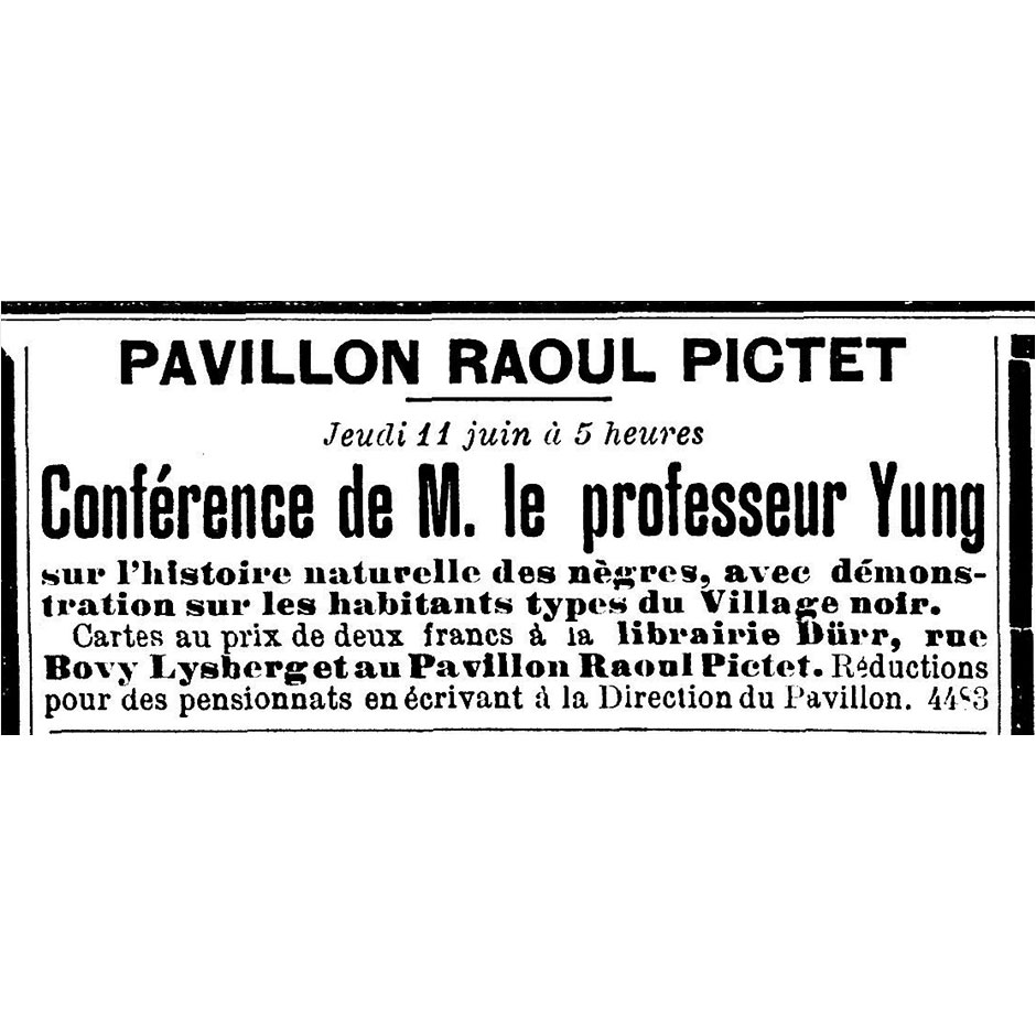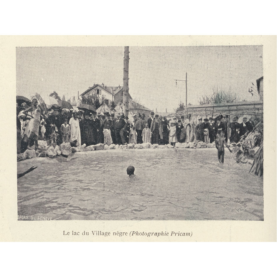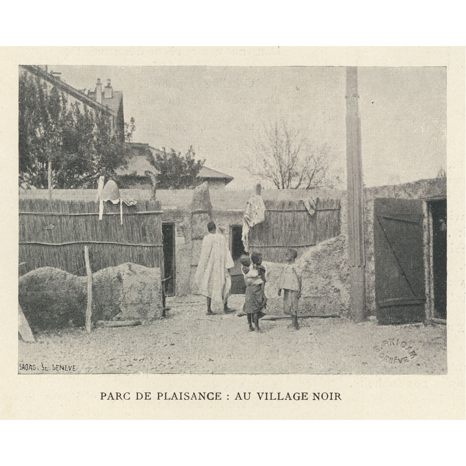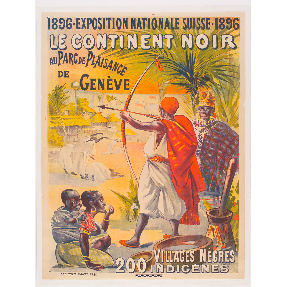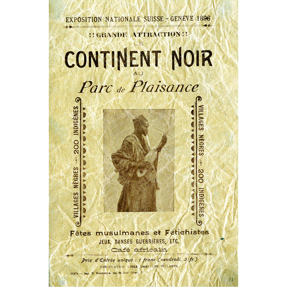 Les avancées de la conquête coloniale se matérialisent en Europe au 19e siècle sous plusieurs formes, y compris dans le spectacle. Les « zoos humains » étaient des attractions à vocation touristique. Clôturé-e-s dans des parcs ou jardins botaniques, des autochtones provenant de territoires colonisés étaient forcé-e-s de mettre en scène leur quotidien pour divertir le public européen. Un « Village noir » a été aménagé au Parc de Plaisance de Genève à l’occasion de l’Exposition nationale suisse de 1896. Des dizaines de milliers de personnes ont pu ainsi observer de près ce qui leur était présenté comme un peuple en bas de la hiérarchie humaine. Les exhibitions humaines ont contribué à développer et diffuser les stéréotypes racistes en Europe, mais aussi à façonner les identités nationales. À l’époque où ce continent est dominé par les patriotismes, l’identité des nations s’affirme grâce à la confrontation directe avec l’altérité. La Suisse ne fait pas exception en cela.