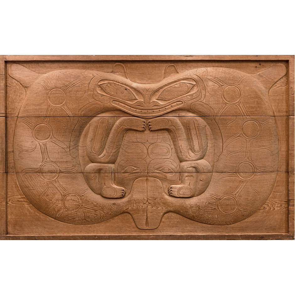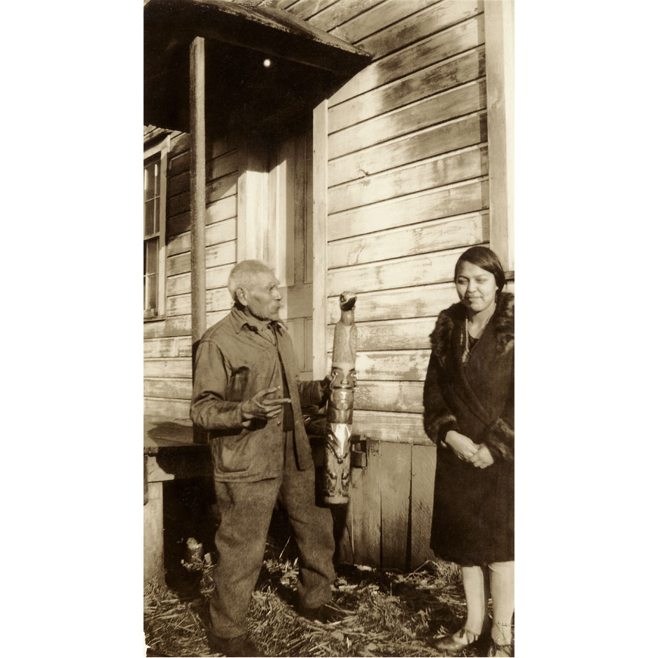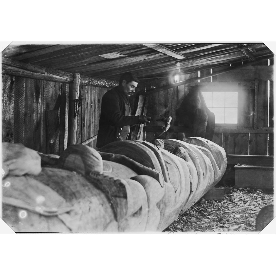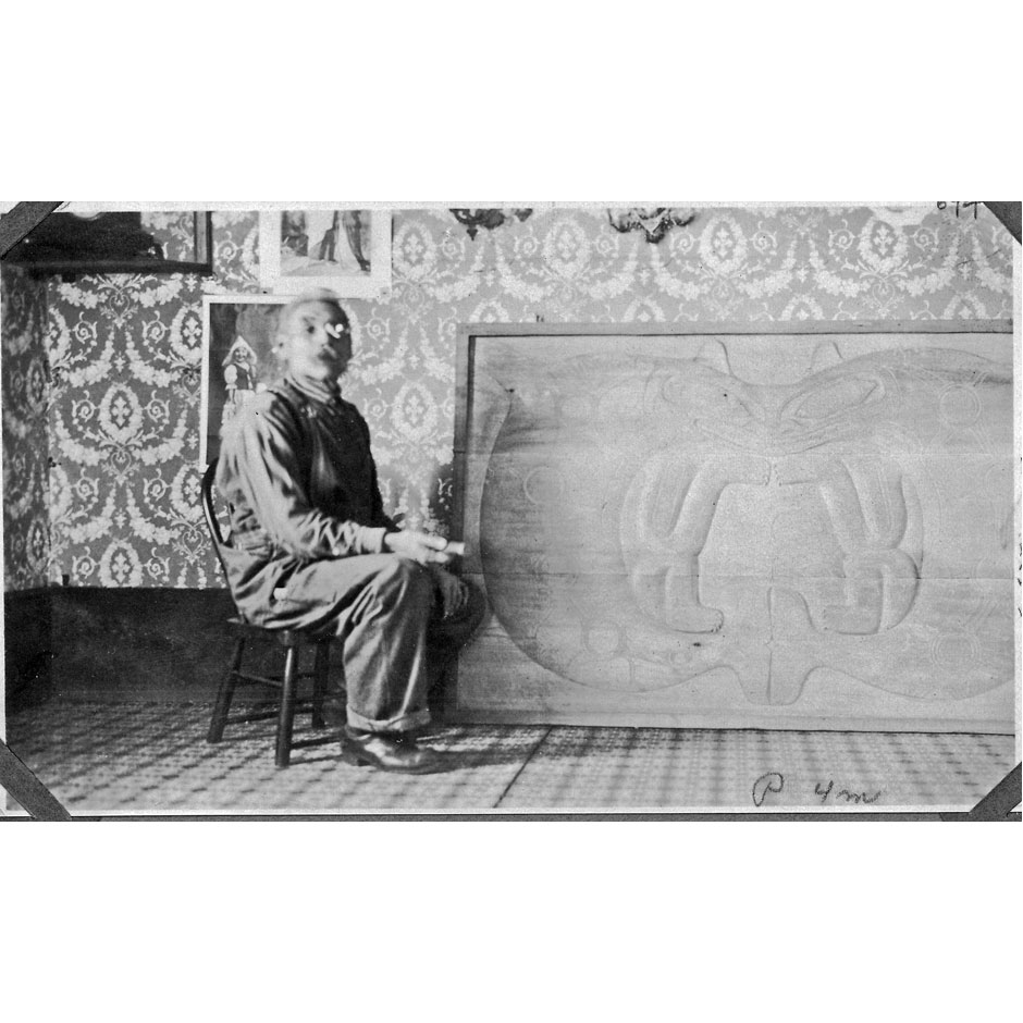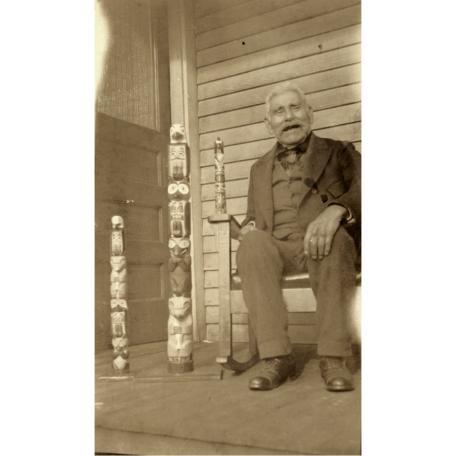 Sm’oogyit Niishluut – Chief Sidney Campbell was a Ts’msyen master carver and the first from Metlakatla, Alaska to make and raise full-sized totem poles. Two of his totem poles are in MEG’s collection. Niishluut was born in 1840 in Lax Kw’alaams, British Columbia and died in Metlakatla, Alaska in 1934. Ts’msyen and Christian beliefs provided the foundation of his work as a carver and a leader among his people. From childhood, he trained as a Gitsontk, a powerful secret society of carvers specializing in Naxnox (elaborate ceremonial masks and headdresses). Upon being baptized as an adult, he received the name Sidney Campbell. As a founder of Metlakatla, Alaska, his negotiation skills were pivotal in their acquisition of land rights. There, he continued to carve, sing ceremonial songs, tell adaawx (ancient oral history), and teach others, including his grandson, Solomon Guthrie. Many of Solomon’s descendants, including master weaver Myranell Bergtold and carver Clifton Guthrie, continue Niishluut’s legacy and work diligently to ensure his history is known.