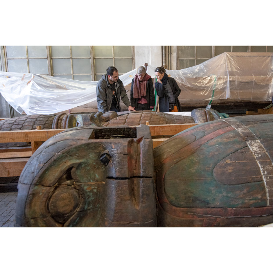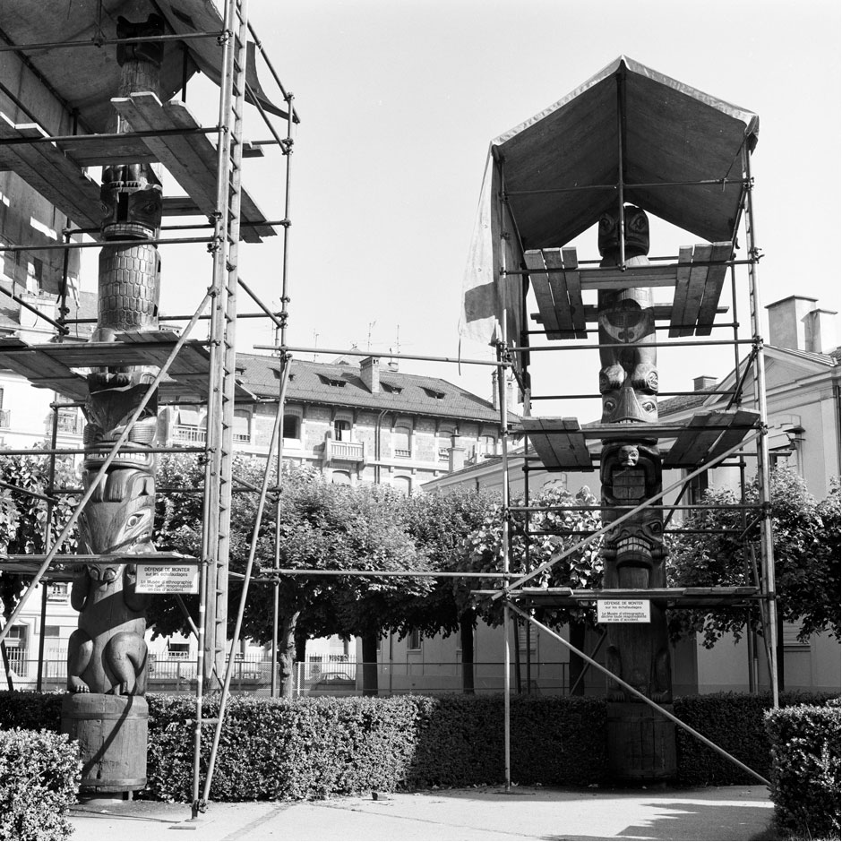 For 34 years, the Ts’msyen crane and thunderbird totem poles were part of the lives of the people of Geneva. George Barbey purchased them in 1955 in the town of Ketchikan, in south-east Alaska. He donated them to the Ethnography Museum where their installation was inaugurated on 9 June 1956. On 12 May 1990, they were taken down for safety reasons and replaced in 2000 by copies. Today these are standing in Gourgas Park while the original totem poles are kept in the museum’s storage. Today, the question of these two totem poles’ conservation and future has brought together the people for whom they matter. Descendants of the carver Sm’oogyit Niishluut – Chief Sidney Campbell and members of the family of Georges Barbey, the donator, have been meeting and discovering their respective attachment to these objects. Links are being formed as the history of these two totem poles and the meaning they have for all those involved is explored.
