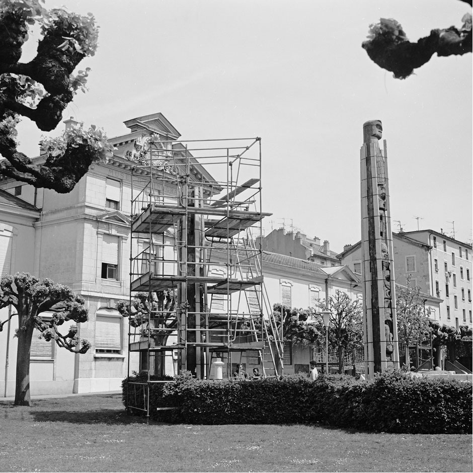 The Ts’msyen Crane and Thunderbird Totem Pole in front of the Ethnography Museum of Geneva in the early 1960s
