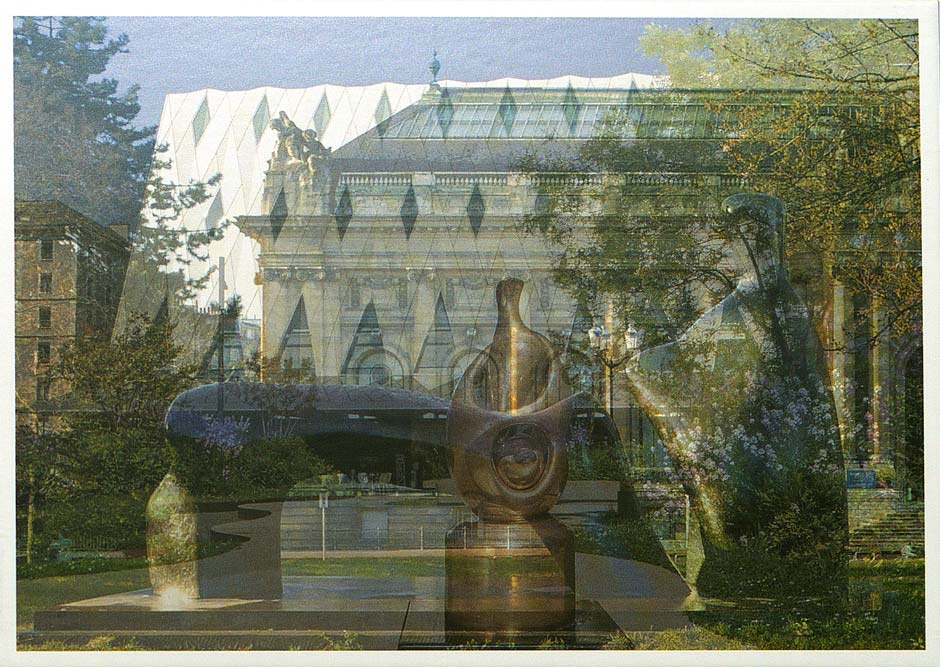 La carte postale présente sur son recto une superposition de deux images ; l’une, réalisée par Johnathan Watts en 2017, appartient au MEG et l’autre, produite par Bettina Jacot-Descombes, est la propriété du MAH. Son verso porte la reproduction d’un tampon d’après un fragment de fresque au fusain par Nicolas Party (exposition Landscape, Kunsthall Stavanger, 2014) d’après Barbara Hepworth (Figure for Landscape, 1959-1960). M. C. Pfund
